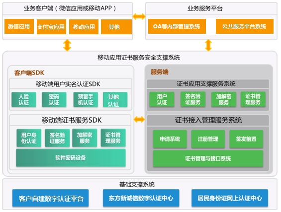 DFCA “移动证书在线签发与验证平台”提供移动(手机)证书应用支撑服务,平台与国家公安部“人口身份数据库”、“居民身份证网上副本”对接,完成“在线人脸识别”及移动证书的服务管理,解决移动端用户实名认证及系统登录身份验证问题,同时可实现“无证书用户”临时、及时申请数字证书并安全登录平台,以及法人代表、岗位人员等所有“有证书用户”在线续签、在线验证等安全应用。