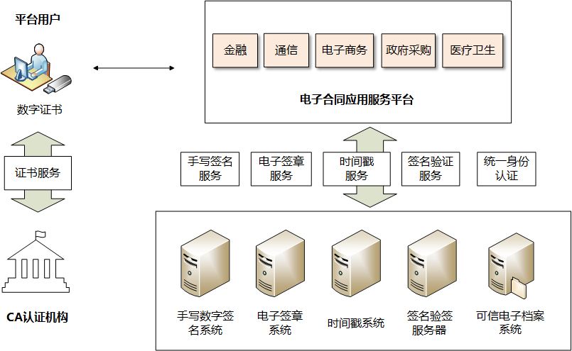 电子合同安全解决方案基于电子认证支撑体系设计,相关产品包括数字证书、手写数字签名系统、电子签章系统、时间戳系统、可信电子档案系统、签名验签服务器等。利用手写数字签名系统将手写签名笔迹与数字证书绑定,基于数字证书、电子取证技术实现签署人的身份认证,同时通过签名验签服务器提供电子签名与签名验证功能;电子签章系统提供合同签署方的电子签章服务,实现签署主体的责任认定和不可抵赖;时间戳系统为电子合同签署时间提供可靠的依据;可信电子档案系统为电子合同业务提供可信归档服务。
